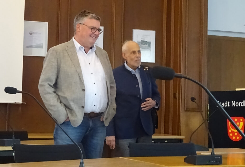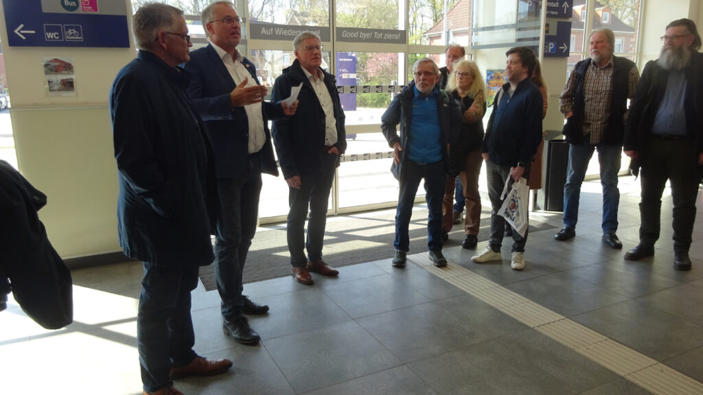 Im Nordhorner Rathaus empfingen Bürgermeister Thomas Berling und Herr Harald Krebs, ehemaliger Wirtschaftsförderer des Landkreises Leer und Ratsmitglied der Stadt Nordhorn, die Gruppe aus Ostfriesland. Bürgermeister Berling berichtete von den positiven Veränderungen, die sich mit der Bahnanbindung für die Stadt ergaben. Auf Veränderungen entlang der Strecke im ländlichen Raum befragt berichtete Herr Berling über Gewerbe Neuansiedlungen nahe den Haltepunkten und hob Steigerungen der Grundstücksbewertungen hervor.