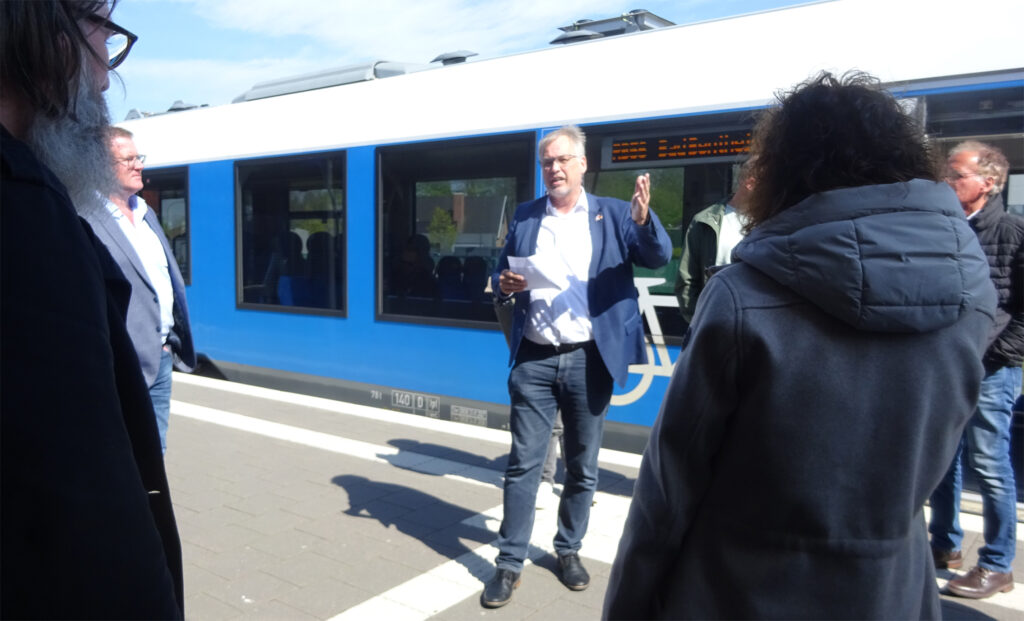 Lärmbelästigung durch AKKU-Triebwagen? Hohe Lärmschutzwände? Sinkende Grundstückswerte? Weniger Bahnübergänge? Geldverschwendung? Befürchtungen und viele Fragen äußerten Anwohner und Politiker aus Südbrookmerland in den Medien. Fragen, die nicht durch die Machbarkeitsstudie sondern erst im Planungsverfahren belastbar beantwortet werden können. Am 15.04.2026 besichtigten Auricher und Südbrookmerländer eine reaktivierte Bahnstrecke, im Rahmen einer Informationsfahrt zur Bentheimer Eisenbahn. Die Teilnehmer erhielten einen umfangreichen Einblick darüber, wie sich SPNV im ländlichen Raum gestalten lässt, wie es angenommen wird und was es zu beachten gilt.